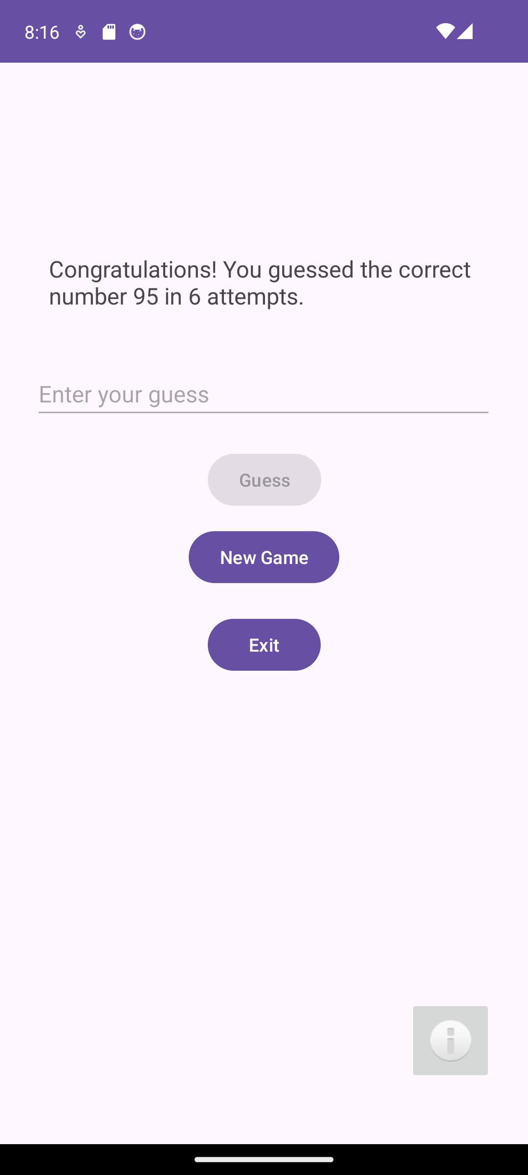 If you enter the correct number, you will be presented with a message indicating that you have won the game, what the number was, and how many attempts you made.